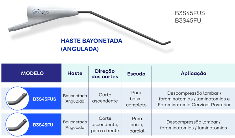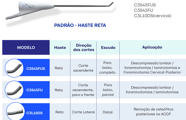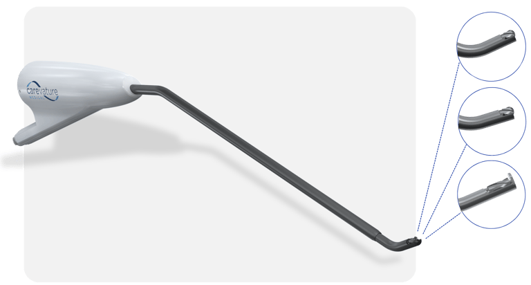 A Cânula de Corte Carevature® é o primeiro e único sistema de descompressão elétrico, estéril e descartável do mercado. Seu revolucionário e exclusivo design angulado com escudo de proteção neural, aliado a um potente motor NSK de 60.000 RPM, foi projetado para permitir ao cirurgião uma “linha de visão” clara com a área de trabalho e cortar tecidos ósseos com rapidez, alta precisão e total segurança ao elemento neural.